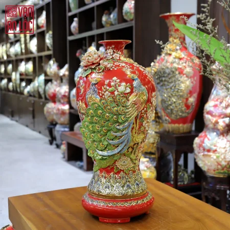 Lộc bình Công Danh Phú Quý Men Đỏ Ruby Vẽ Màu Đắp Nổi Vẽ Vàng