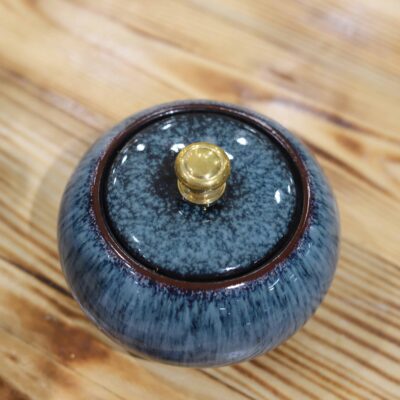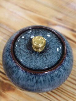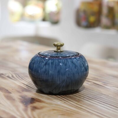 Men xanh hỏa biến được tạo nên trong quá trình nung ở nhiệt độ cao, khi lửa tác động khiến sắc men chuyển biến ngẫu nhiên, tạo nên những gam xanh sâu, loang chuyển tự nhiên, mỗi chiếc hũ là một phiên bản độc bản. Màu xanh tượng trưng cho sự tĩnh tại, thanh khiết và cân bằng, rất phù hợp với tinh thần thưởng trà an nhiên, chậm rãi.