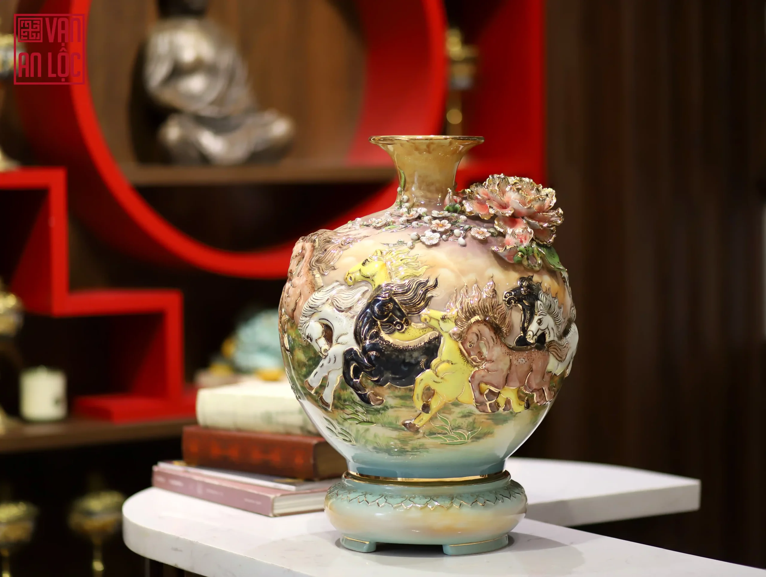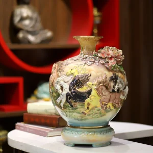 Bình hút lộc dáng bóng của Vạn An Lộc với các họa tiết Công Danh Phú Quý, Mã Đáo Thành Công, Liên Hoa Cát Tường, Thuận Buồm Xuôi Gió mang trên mình lớp men rạn cổ đặc trưng của làng gốm Bát Tràng – một loại men trứ danh với những đường rạn chạy tự nhiên, trầm mặc như dòng chảy của thời gian. Mỗi sản phẩm là một bản thể duy nhất, không trùng lặp, tạo nên vẻ đẹp hoài cổ, uy nghiêm và cực kỳ phù hợp với không gian thờ cúng truyền thống của người Việt. Không chỉ giới hạn ở dòng men rạn, mà sản phẩm còn có những màu men phong thủy, Vàng Hoàng Yến, Đỏ Ruby…. phù hợp cho từng mệnh gia chủ.
