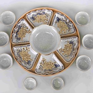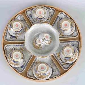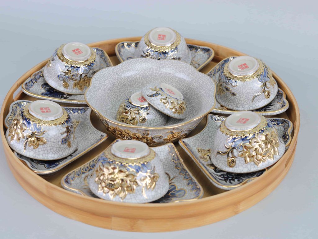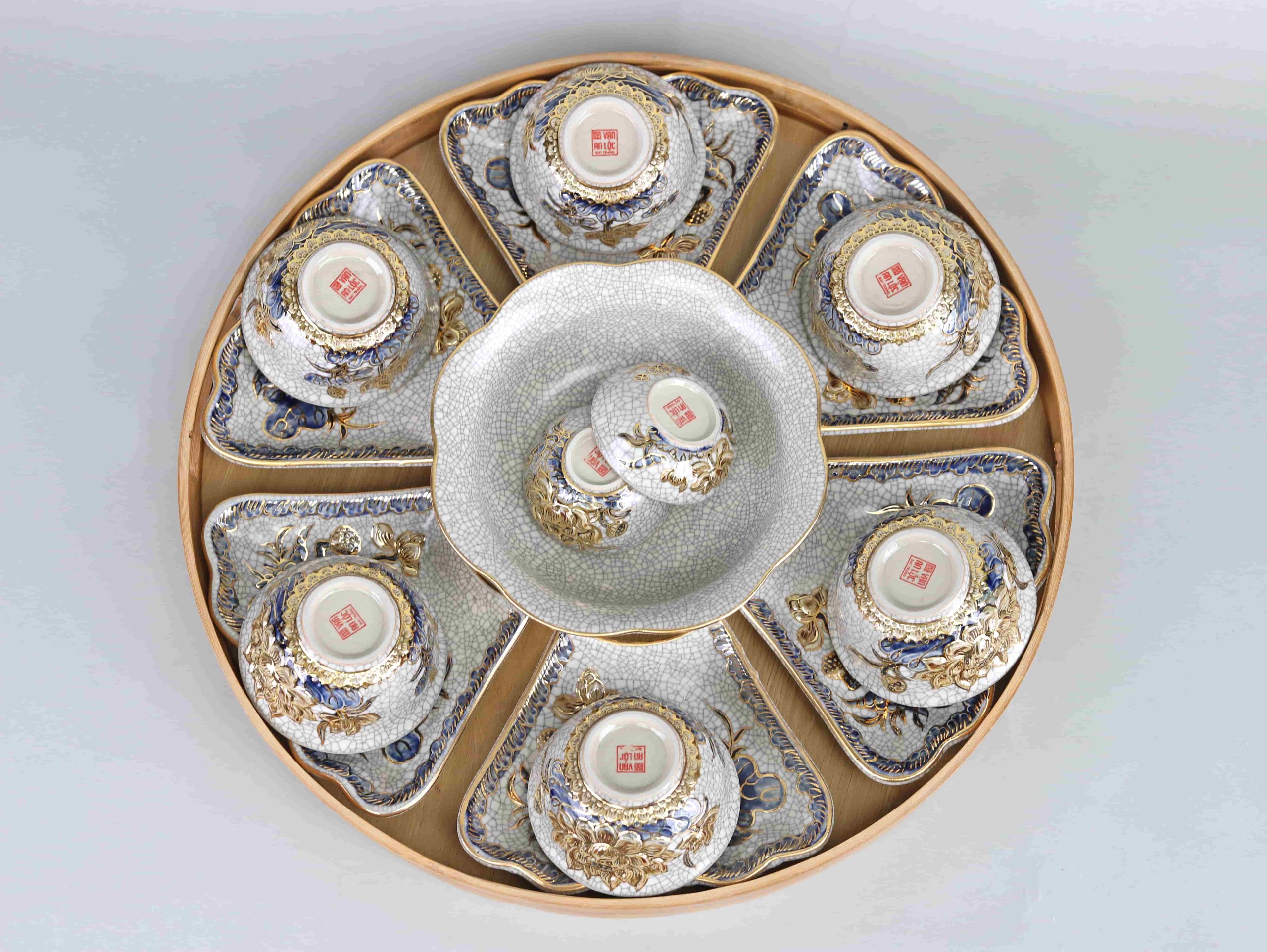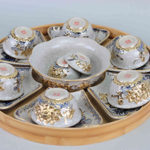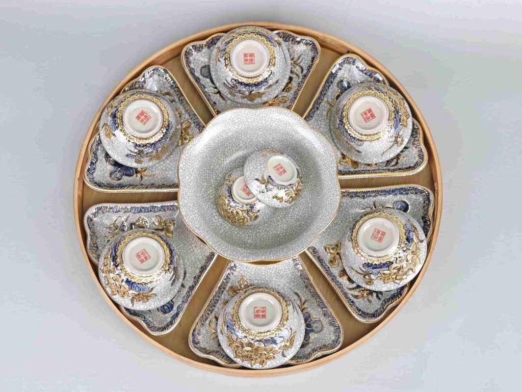 1 Bộ đồ ăn HMT bao gồm: 6 Bát con, 6 Đĩa cánh, 1 Tô canh, 1 Bát mắm, 1 Bát muối – tặng kèm khay tre.