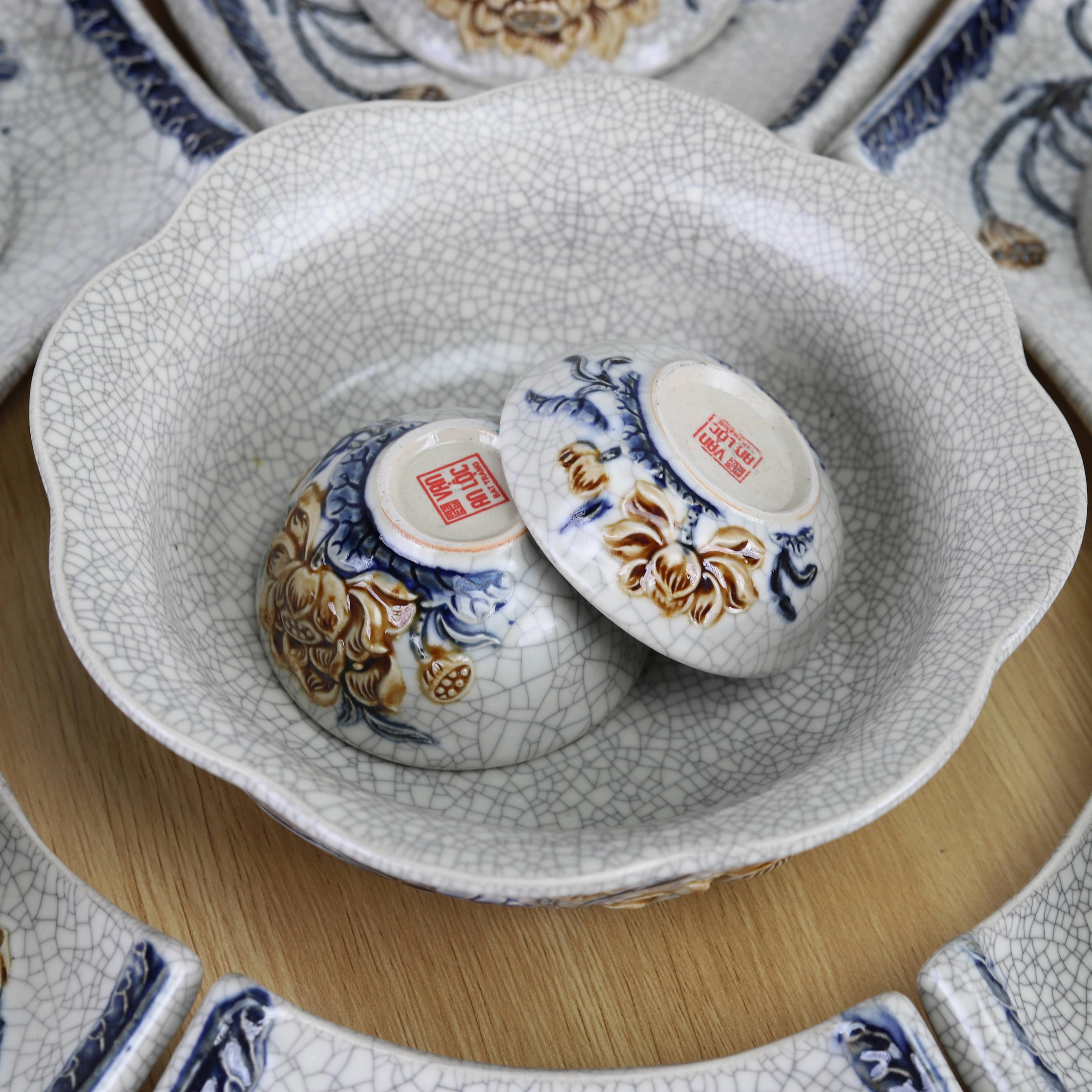 Được nung ở nhiệt độ cao trên 1200°C, bộ đồ ăn có cốt gốm cực kỳ đanh chắc, chịu được va đập tốt và bền màu vĩnh cửu. Quy trình nung này giúp loại bỏ hoàn toàn các tạp chất và chì, đảm bảo an toàn tuyệt đối cho sức khỏe người sử dụng. Bề mặt men rạn nhưng mịn màng, rất dễ dàng vệ sinh, không bám bẩn, phù hợp cho cả bữa cơm gia đình hàng ngày lẫn những buổi tiệc trang trọng.