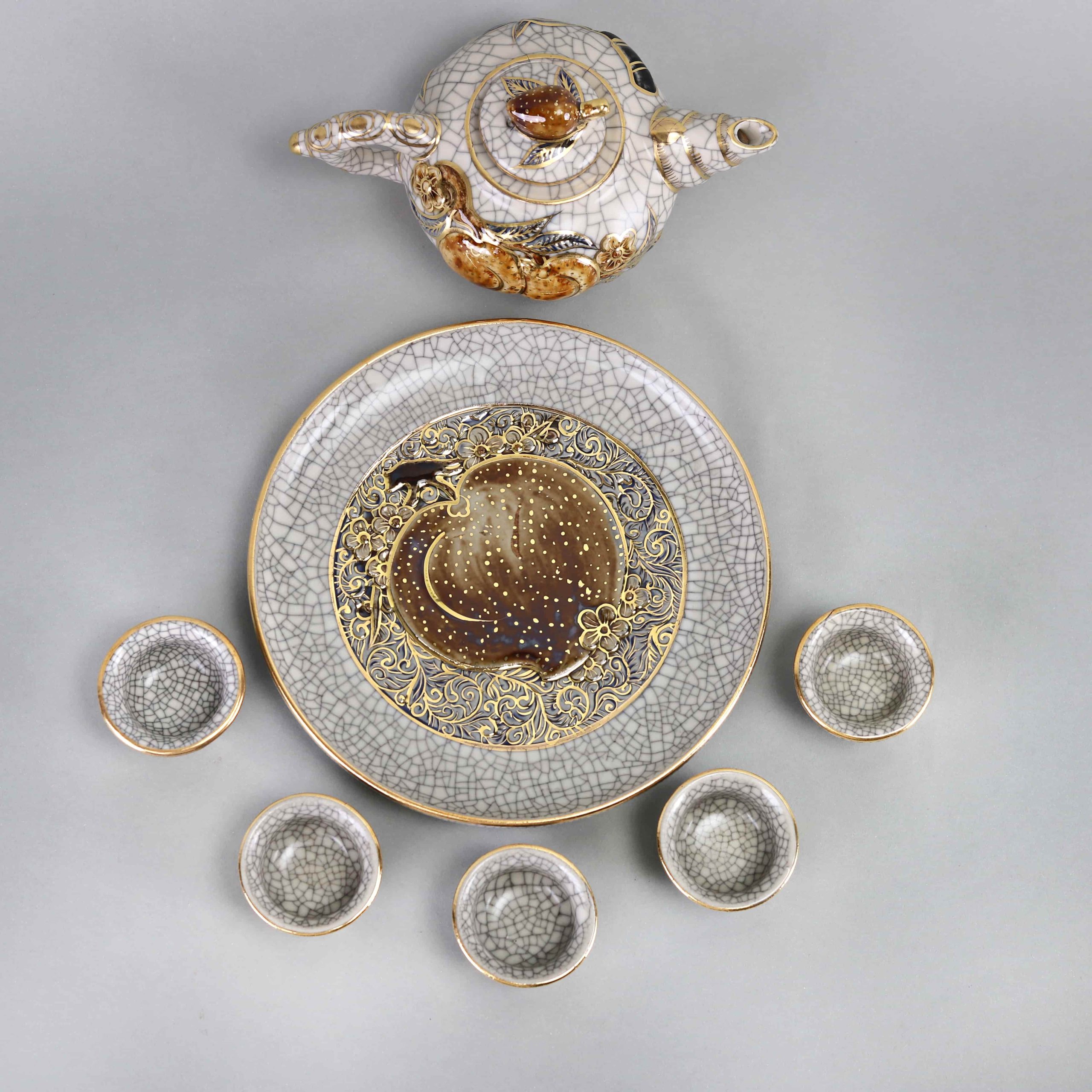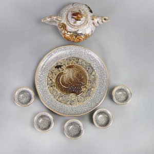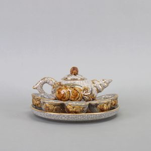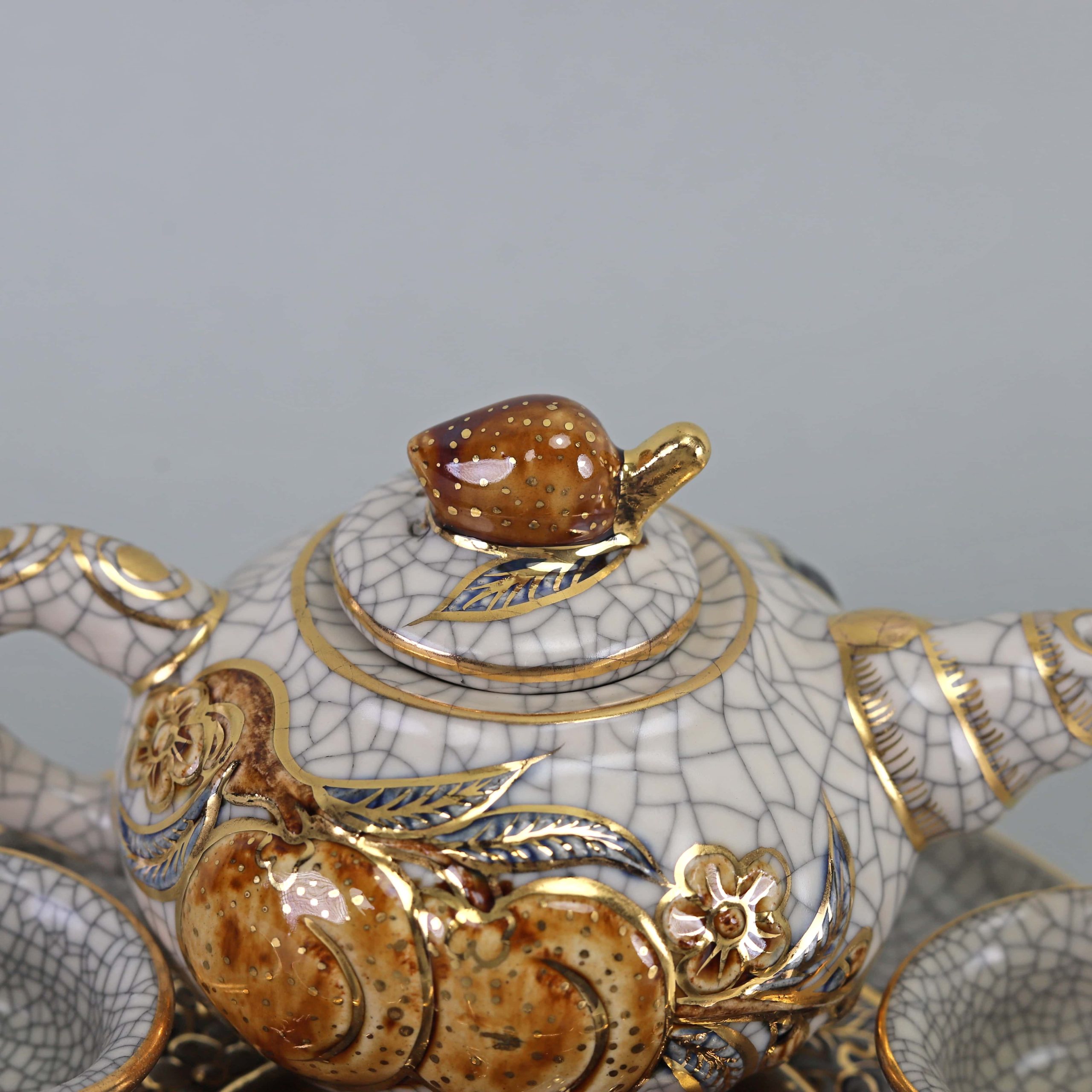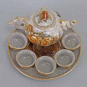 Bộ trà đắp nổi mang trên mình lớp men rạn cổ đặc trưng của làng gốm Bát Tràng – một loại men trứ danh với những đường rạn chạy tự nhiên, trầm mặc như dòng chảy của thời gian. Mỗi sản phẩm là một bản thể duy nhất, không trùng lặp, tạo nên vẻ đẹp hoài cổ, uy nghiêm và cực kỳ phù hợp với không gian thờ cúng truyền thống của người Việt.