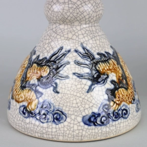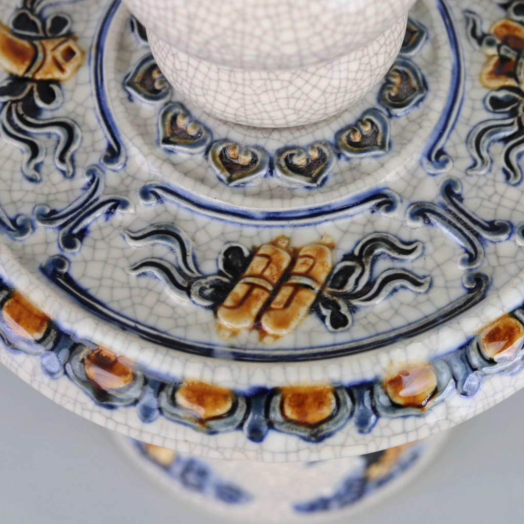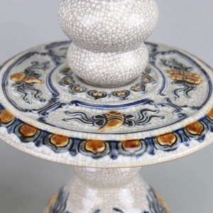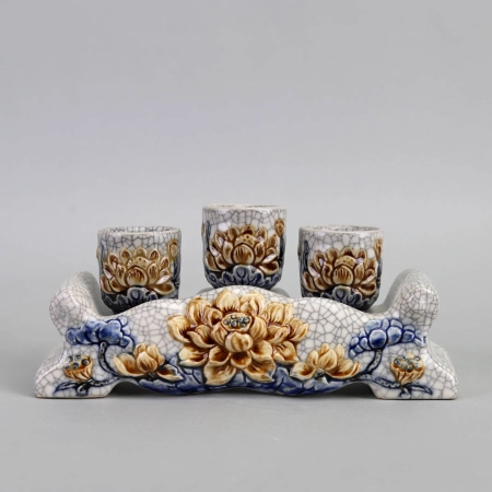 Cây nến men rạn đắp nổi là sự hội tụ tinh hoa của làng gốm cổ Bát Tràng, mang vẻ đẹp hoài cổ và sang trọng đặc trưng của dòng gốm nghệ thuật cao cấp. Điểm nhấn giá trị nhất nằm ở lớp men rạn – một kỹ thuật bí truyền từ thế kỷ XVI với những đường vân rạn tự nhiên, trầm mặc như dấu ấn của thời gian. Kết hợp cùng nghệ thuật đắp nổi thủ công tỉ mỉ, mỗi sản phẩm hiện lên như một tác phẩm điêu khắc sống động với các họa tiết như hoa sen, rồng chầu hay mây hạc, tạo nên chiều sâu mỹ thuật và sự uy nghi cho không gian trưng bày.
