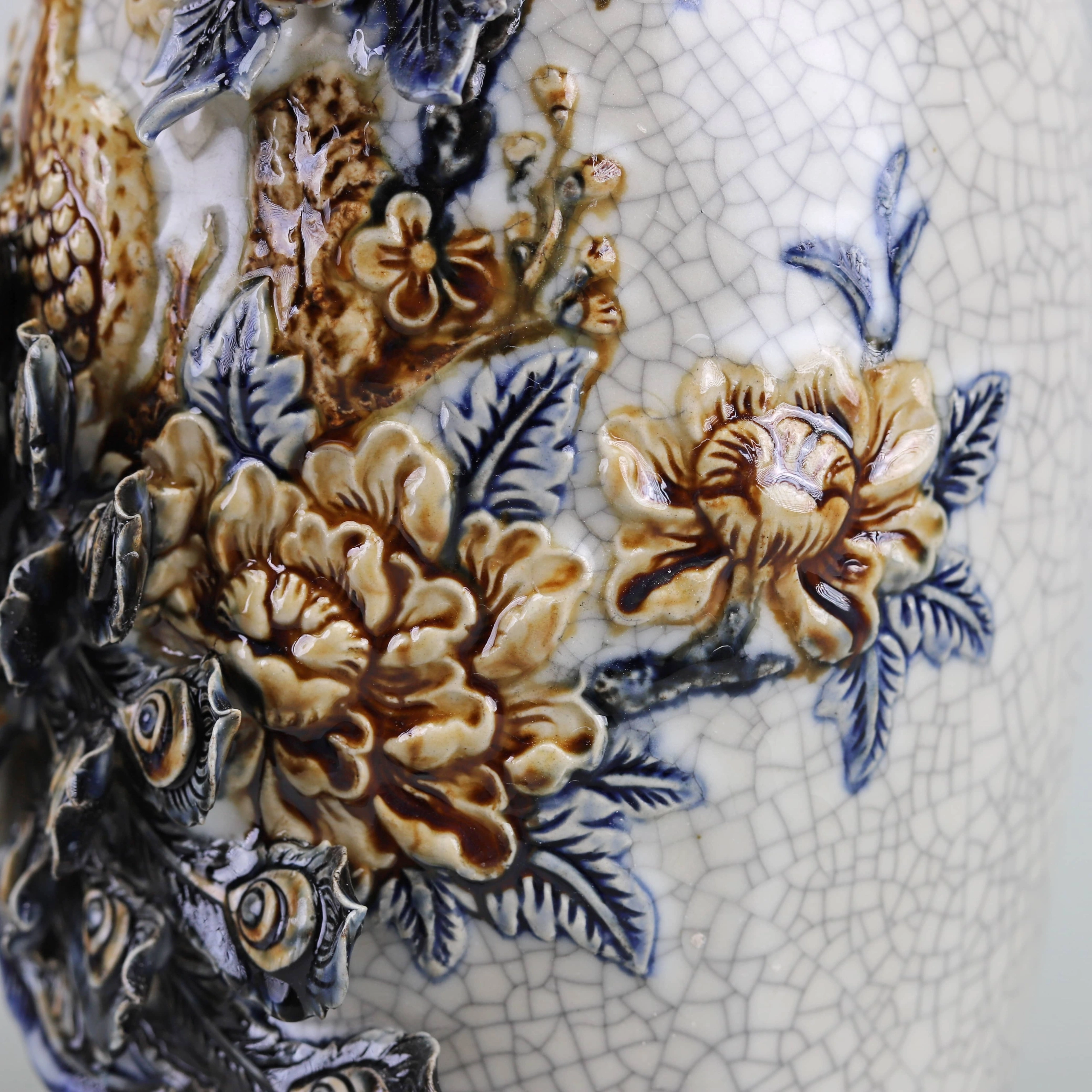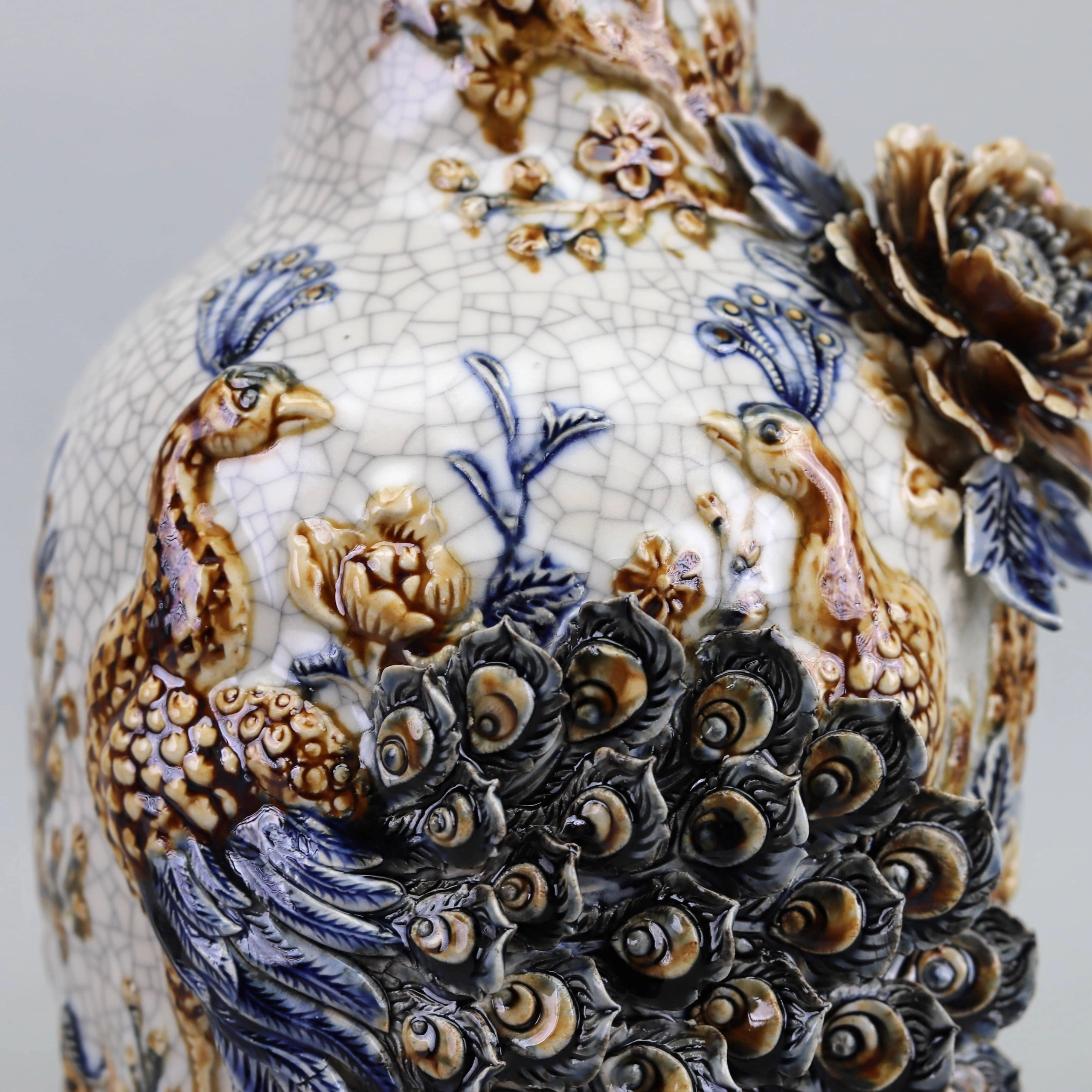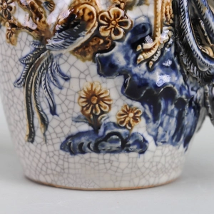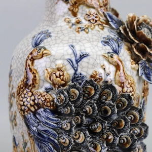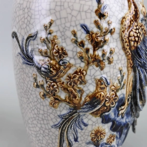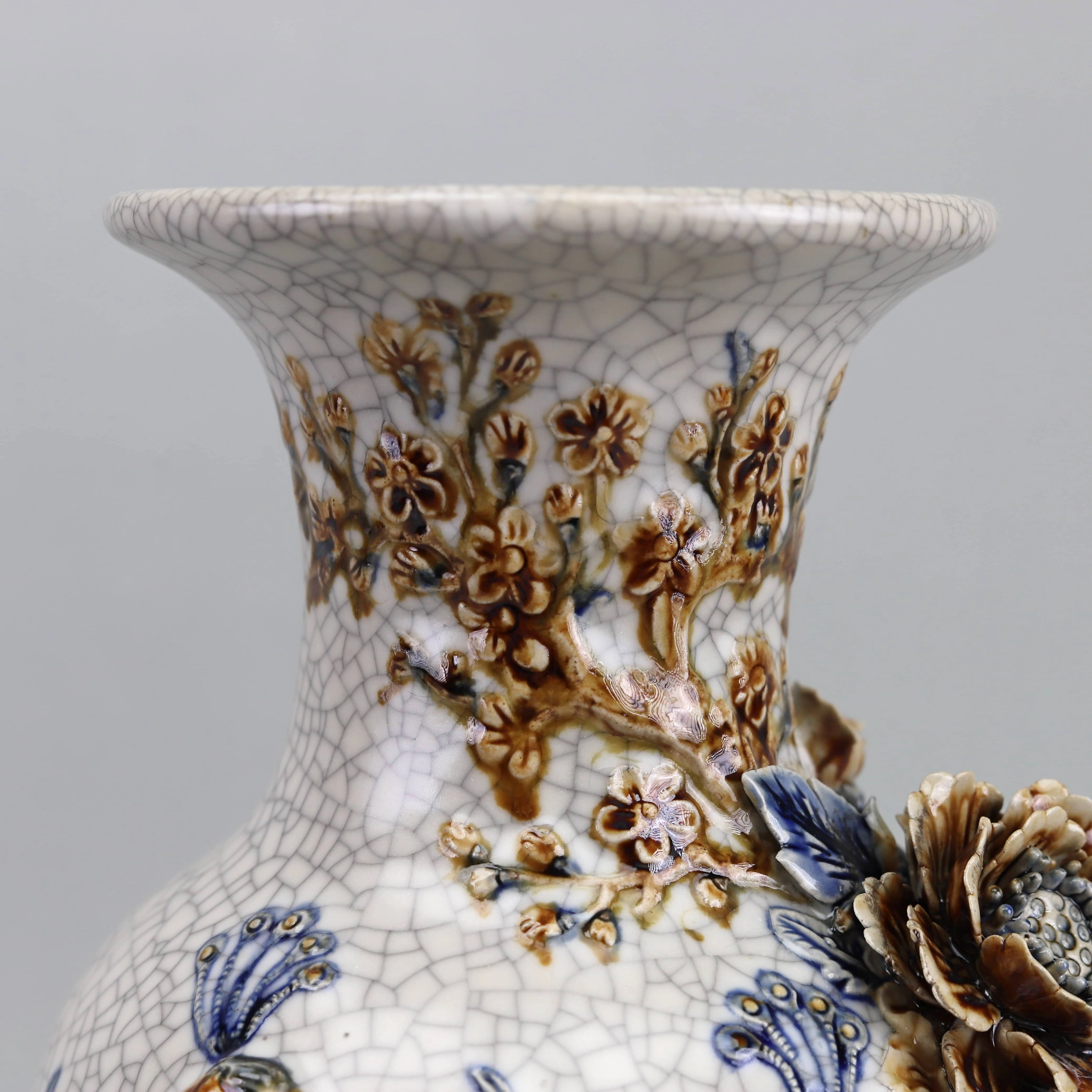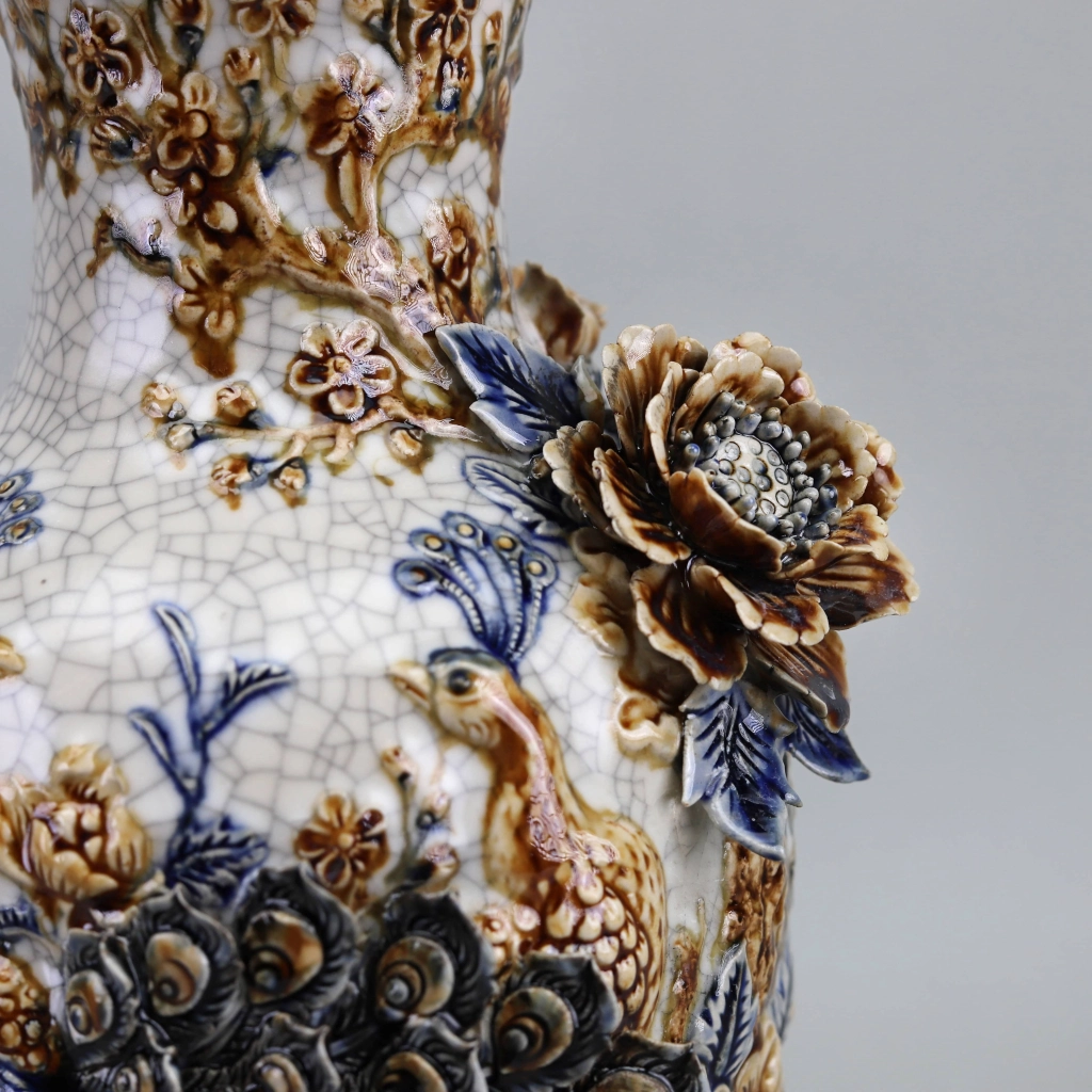 Lọ cắm hoa dáng Lộc Bình họa tiết Công Danh Phú Quý, men rạn đắp nổi của Vạn An Lộc mang trên mình lớp men rạn cổ đặc trưng của làng gốm Bát Tràng – một loại men trứ danh với những đường rạn chạy tự nhiên, trầm mặc như dòng chảy của thời gian. Mỗi sản phẩm là một bản thể duy nhất, không trùng lặp, tạo nên vẻ đẹp hoài cổ, uy nghiêm và cực kỳ phù hợp với không gian thờ cúng truyền thống của người Việt.