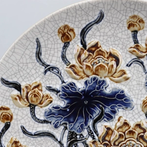 Mâm bồng họa tiết Rồng Phượng – Hoa Sen, men rạn đắp nổi của Vạn An Lộc mang trên mình lớp men rạn cổ đặc trưng của làng gốm Bát Tràng – một loại men trứ danh với những đường rạn chạy tự nhiên, trầm mặc như dòng chảy của thời gian. Mỗi sản phẩm là một bản thể duy nhất, không trùng lặp, tạo nên vẻ đẹp hoài cổ, uy nghiêm và cực kỳ phù hợp với không gian thờ cúng truyền thống của người Việt.